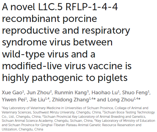 Gao X, Zhou J, Kang R, et al. A novel L1C.5 RFLP-1-4-4 recombinant PRRSV between wild-type virus and a modified-live virus vaccine is highly pathogenic to piglets. Frontiers in Veterinary Science. 2025;12:1627238. doi:10.3389/fvets.2025.1627238.