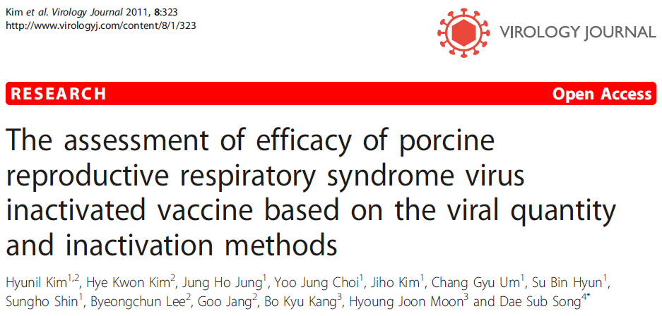 Kim H et al. The assessment of efficacy of porcine reproductive respiratory syndrome virus inactivated vaccine based on the viral quantity and inactivation methods. Virology Journal. 2011;8:323. doi:10.1186/1743-422X-8-323.